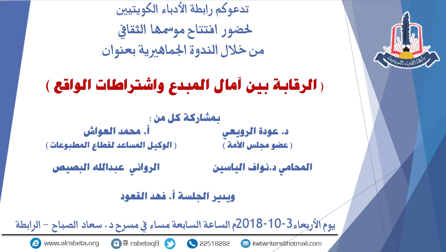 افتتاح الموسم الثقافي بندوة جماهيرية بعنوان ( الرقابة بين آمال المبدع واشتراطات الواقع )