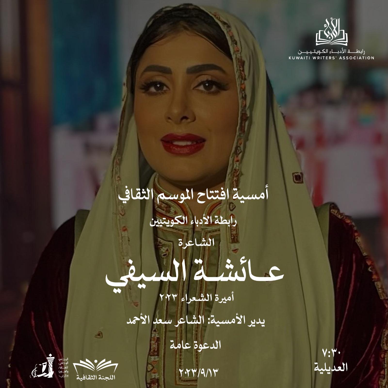 تعلن اللجنة الثقافية في رابطة الأدباء الكويتيين بالتعاون مع المجلس الوطني للثقافة والفنون والآداب عن حفل افتتاح الموسم الثقافي . أمسية لأميرة الشعراء الشاعرة عائشة السيفي .